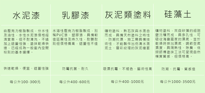 介紹:由壓克力樹脂製成,分水性及油性,水性水泥漆價格經濟實惠。但不耐清洗,不過加上遮蓋性強,塗抹乾燥快速,已經成為一般室內空間粉刷的基本選擇。